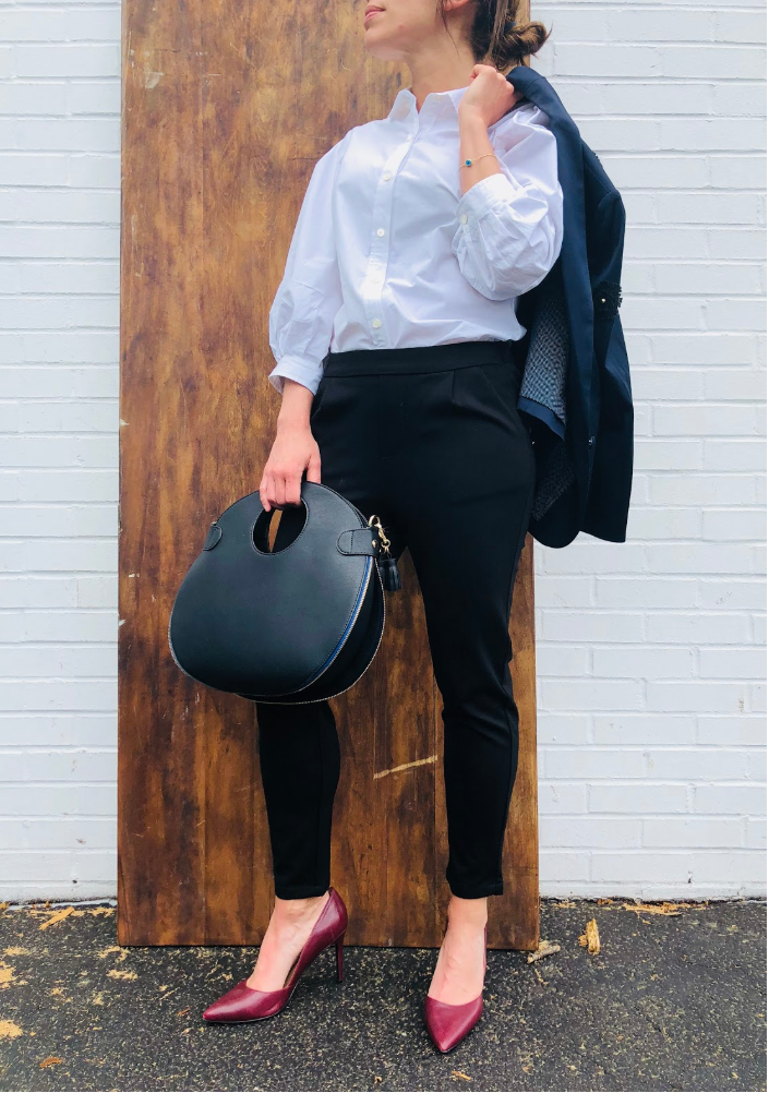 I know this is the old go-to, but it is perfect for the office. Accessories are where you can mix it up here. We chose a basic white button down with a modern shape with the peter pan collar and puffed sleeves and added a muted red pump and circular purse. Or, you could choose a more classic silhouette white button down then pair it with your brightest red pump and handbag for a brighter splash of color. Bonus points for a bright red lip. Never underestimate the bright red lip as an accessory!